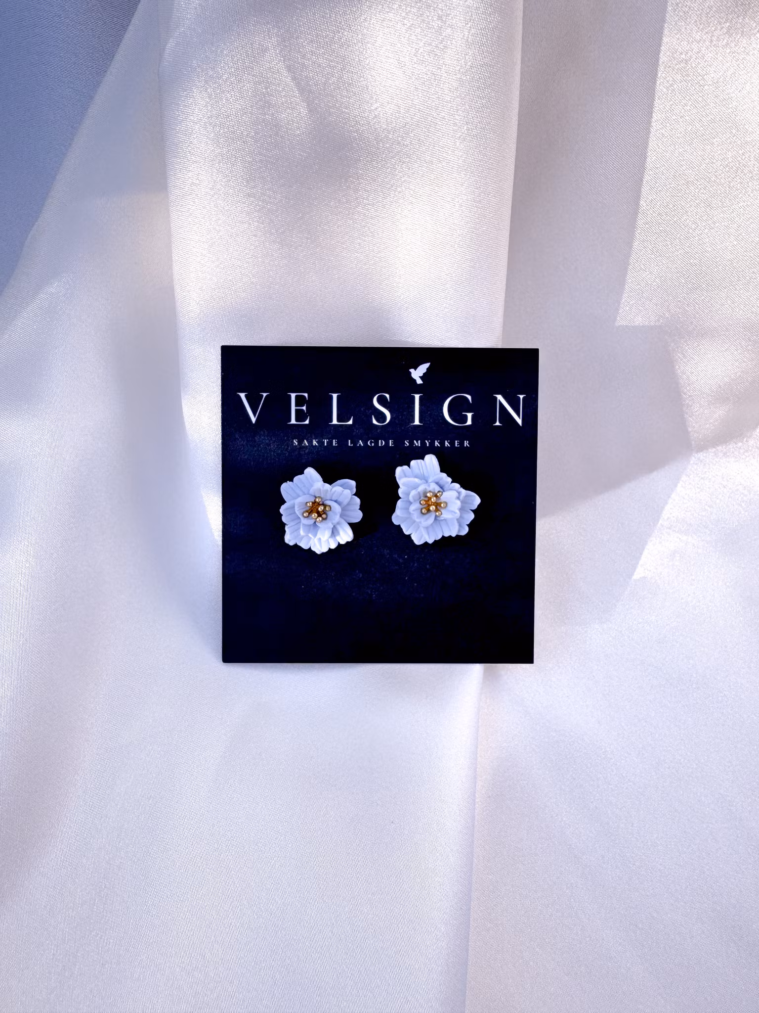 Blomsterdobbene sitter tett på øret, og de er håndlaget av polymerleire i en deilig, våraktig lys blå farge med små, gullbelagte detaljer i midten. Festet er allergivennlig og laget av gullbelagt kirurgisk stål, så de er trygge og komfortable – noe jeg er opptatt av, siden jeg selv har sensitiv hud.