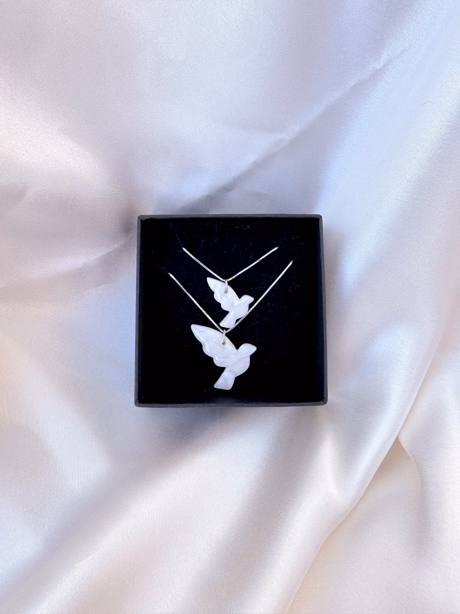 Halskjede i ekte sølv med dueanheng som peker mot hjertesiden. En til mamma og en til mini! Den perfekte gaven!