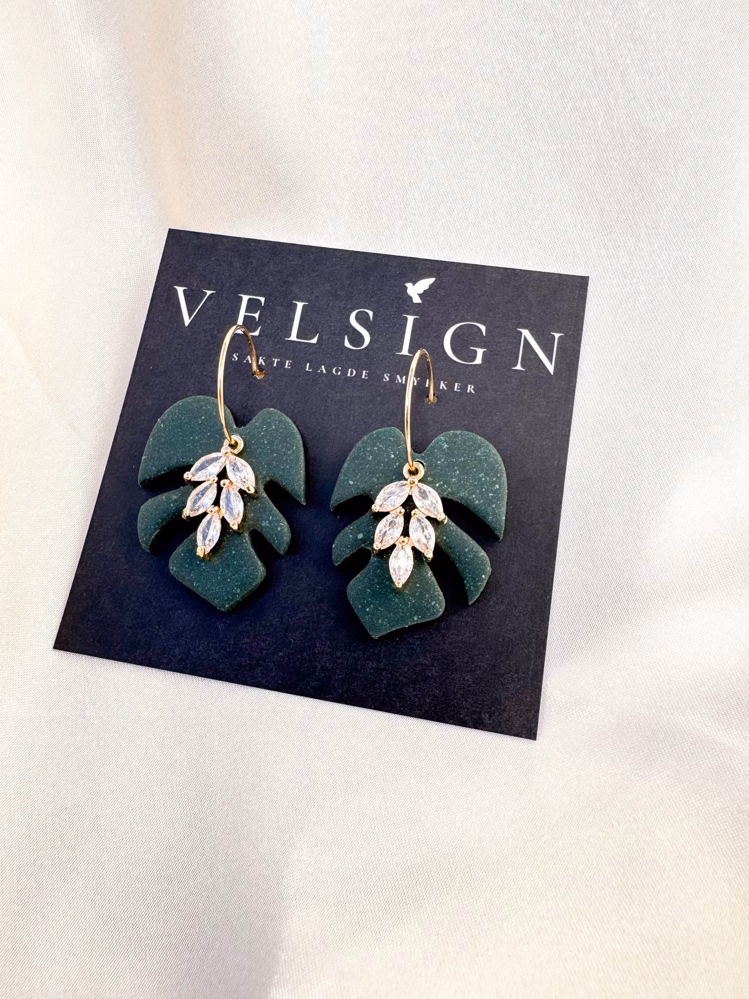 Disse øredobbene er en liten lengsel etter den hagen. De dype, mørkegrønne monstera-bladene, håndlaget i polymerleire, fanger lyset med et diskret glitrende skjær, som dugg i morgensol. De henger fra en enkel, gullbelagt ring med en kjerne av kirurgisk stål – lette, behagelige, laget for å brukes. Og under hvert blad svever en liten cubic zirconia, som en dråpe renhet, en påminnelse om skjønnheten vi er skapt for.