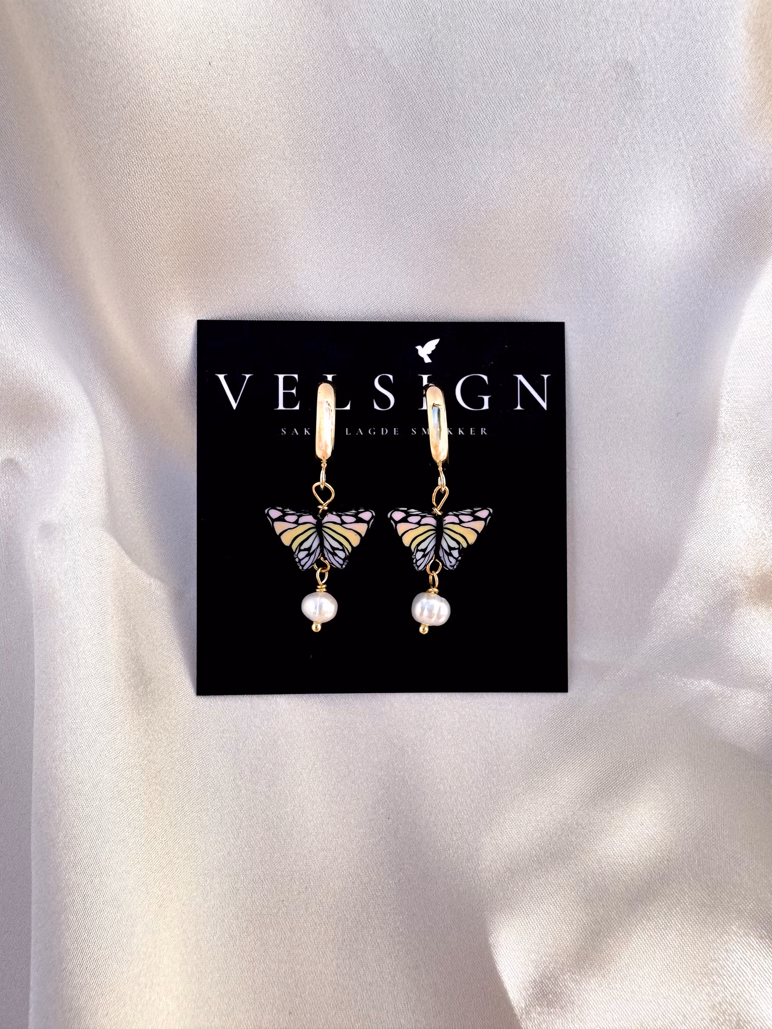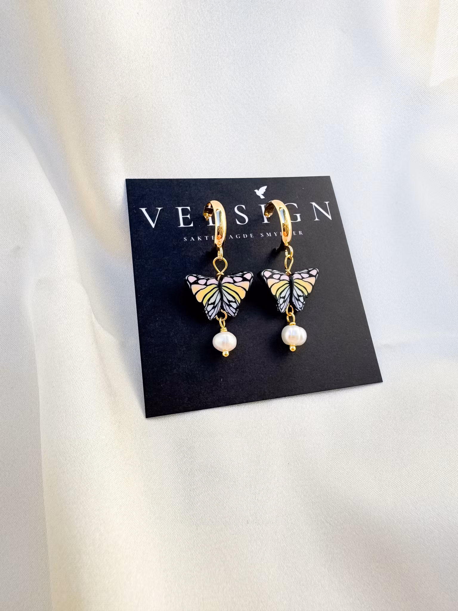 Disse øredobbene er inspirert av den lengselen. En liten sommerfugl i regnbuens farger henger fra en gullbelagt huggie-øredobb – lett, leken og fri. Nålen inn i øret er gullbelagt sterling sølv, forresten. Under sommerfuglen henger en ferskvannsperle, som en dråpe renhet. Sammen minner de oss om at det vakre vi ser glimt av her, bare er en skygge av det som venter oss.